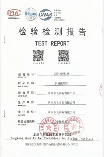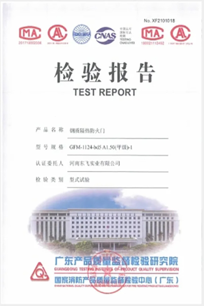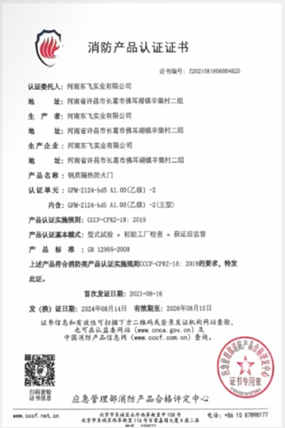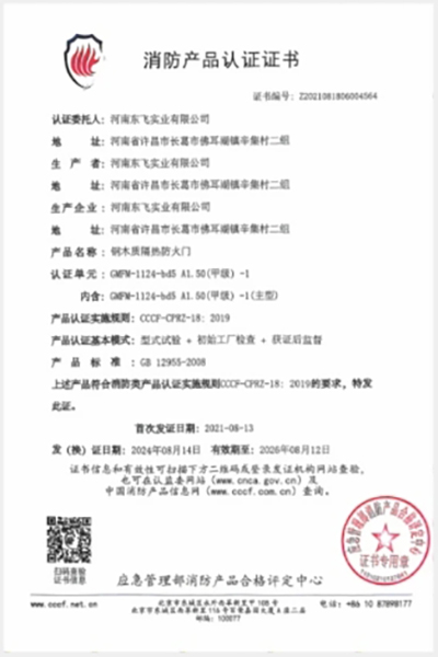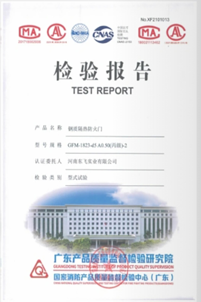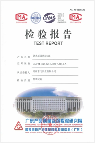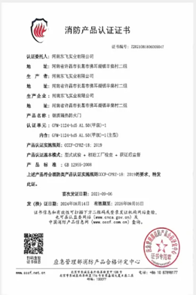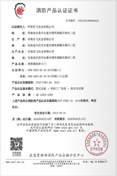 鋼質(zhì)隔熱防火門(mén)分為甲、乙、丙級(jí),均嚴(yán)格按照 GB12955-2008《防火門(mén)》研制而成?!皣?guó)家固定滅火系統(tǒng)和耐火構(gòu)件質(zhì)量監(jiān)督檢驗(yàn)中心”檢驗(yàn)合格,并取得應(yīng)急管理部消防產(chǎn)品合格評(píng)定中心發(fā)放的“中國(guó)國(guó)家強(qiáng)制性產(chǎn)品認(rèn)證證書(shū)”。