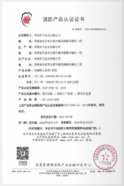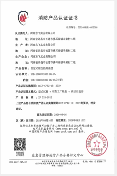 產(chǎn)品經(jīng)應(yīng)急管理部消防產(chǎn)品評(píng)定中心檢驗(yàn),獲得消防產(chǎn)品認(rèn)證證書(shū)